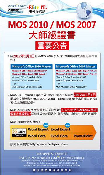 如果你再2012年1月1日前還沒拿到大師級證書的人,可以考慮是否要改考MOS 2010或是繼續考完MOS 2007。